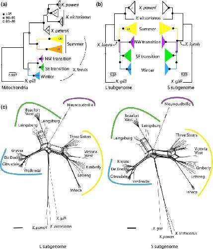 Fig. 5. Evolutionary relationships among mitochondrial sequences (a) are different from (b and c) the L and S subgenomes. In (a) and (b), black, gray, and white nodes indicate bootstrap values as indicated on the scale; numbers inside clades indicate the sample sizes of individuals; samples sizes of the S subgenome (not shown) are identical to those for the L subgenome. The scale bar indicates substitutions per site for the mitochondrial phylogeny; branch lengths of the phenogram are scaled by only variable positions and are not comparable to mitochondrial branch lengths. Samples in each clade of the mitochondrial tree are listed in Supplementary Table 2. Samples with the brown mitochondrial lineage in (a) were not present in the RRGS data (b). In the Neighbor-Net networks in (c), black bars indicate 0.01 substitutions per site for each subgenome.