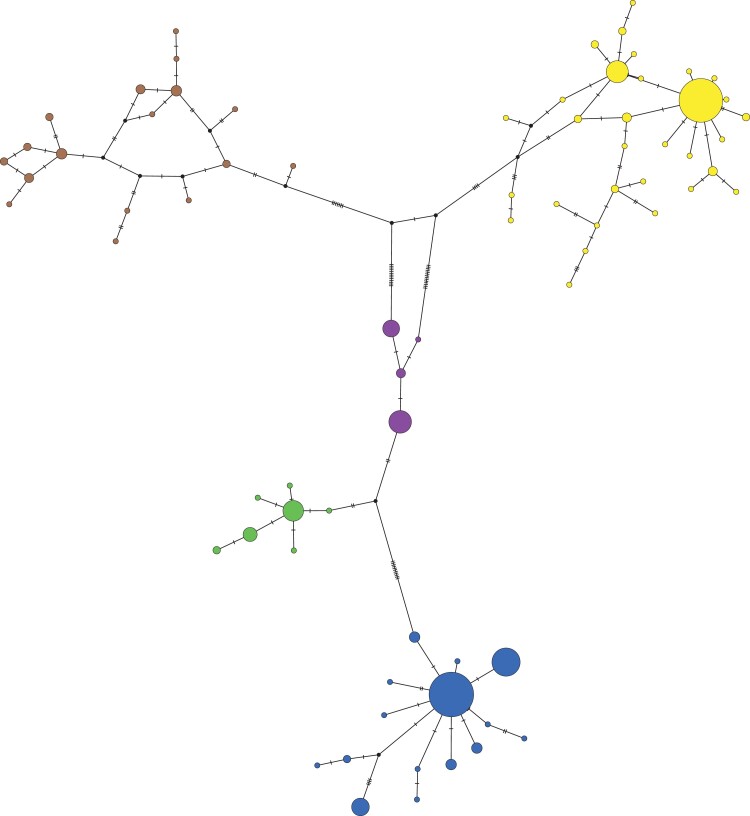 Fig. 6. Parsimony network of partial X. laevis mitochondrial sequences. Colors correspond to Fig. 2; the size of the nodes is proportional to the number of samples with each haplotype. Inferred nodes are indicated with black nodes; hashes on branches indicate changes between nodes that are not represented by a sampled sequence.