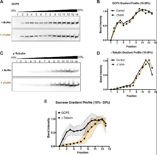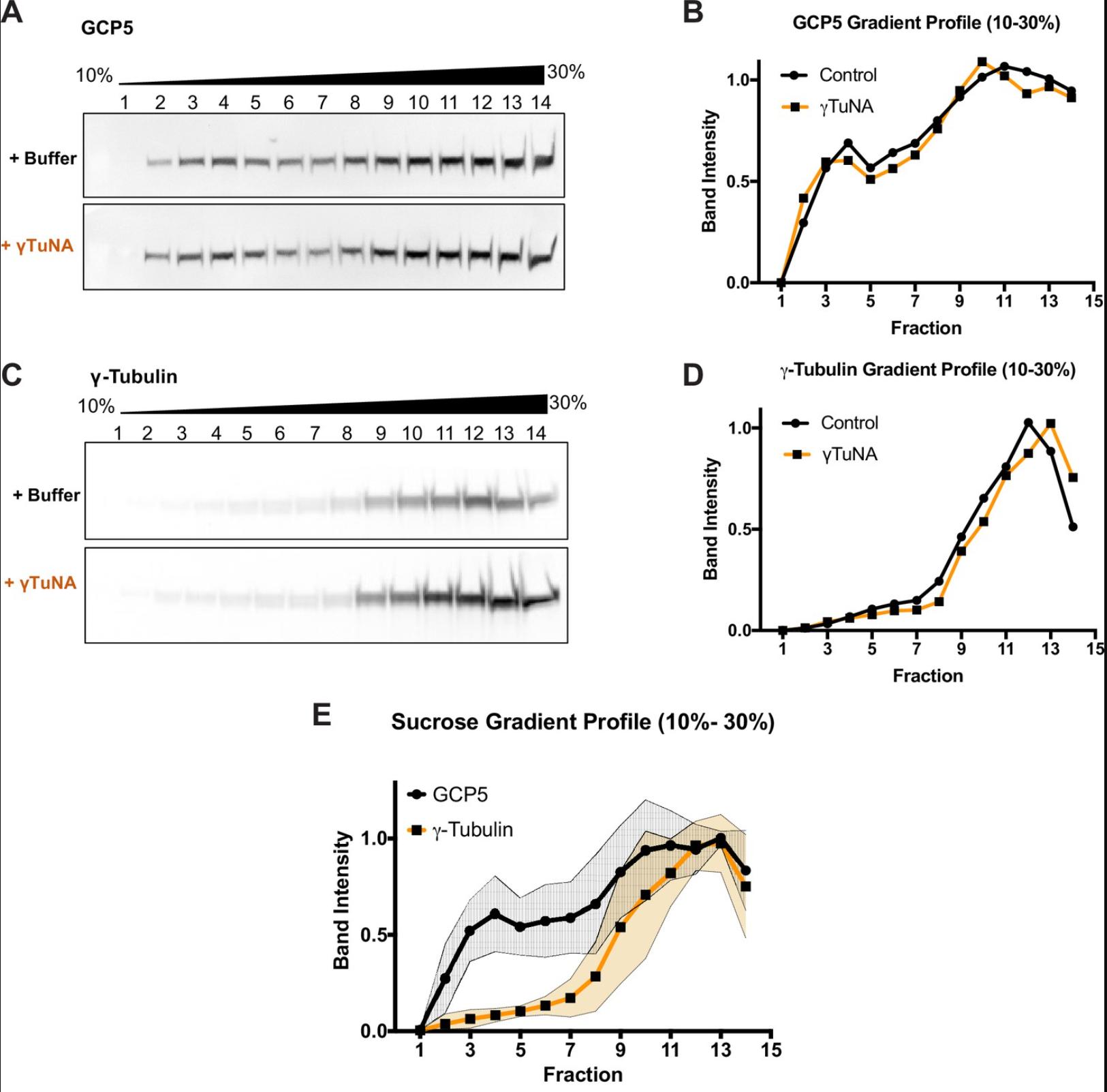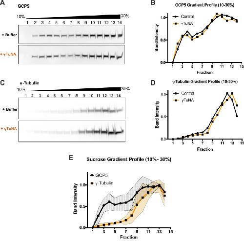 Figure 1—figure supplement 2. Addition of γTuNA to Xenopus egg extract does not affect γTuRC assembly or stability.High-speed centrifuged Xenopus egg extracts were run on 10–30% w/w sucrose gradients and fractionated. Western blots of GCP5 and γ-tubulin were quantified to generate a sucrose gradient profile for each target, as shown in A. GCP5 appeared to be in two separate populations: uncomplexed around fraction 3, and another in the γTuRC complex (around fraction 10–11). (A and C) Western blots of GCP5 and γ-tubulin in gradient fractionated extracts treated with either buffer or 6 µM Strep-His-Xenopus γTuNA for 1 h on ice. The presence of γTuNA did not shift intensity from the soluble peak of GCP5 (fraction 3) to the γTuRC fraction (fraction 11), nor did it have any effect on the distribution of γ-tubulin. (B and D) Normalized band intensity profiles for GCP5 and γ-tubulin. (E) Mean gradient profile for GCP5 and γ-tubulin with standard deviation (N=2). The traces for extracts treated with 6 µM γTuNA do not fall outside the colored regions shown in E. Raw blots are in “Figure 1—figure supplement 2—source data 1.”