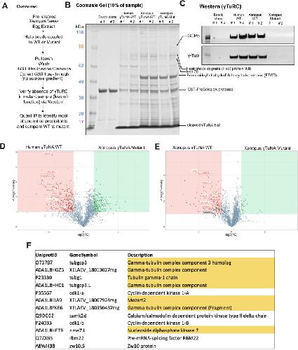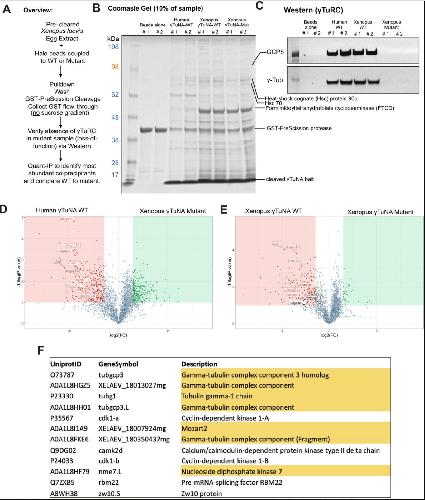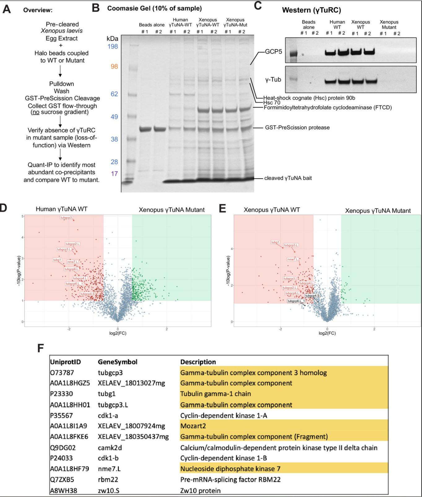 Figure 2—figure supplement 1. Mass spectrometry (Quant-IP) reveals γTuRC is the dominant factor present after extract pulldown of Halo-γTuNA beads.(A) Experiment overview of extract pulldowns with beads coupled to mock, human wildtype, Xenopus wildtype, and Xenopus F75A mutant versions of γTuNA. Bound factors were eluted using PreScission cleaveage of Halo-3C- γTuNA bait. (B) SDS-PAGE and Coomassie stain of 10% of elution sample. The band at ~40 kDa corresponds to GST-PreScission. The band at ~7 kDa (dominant band <17 kDa) corresponds to cleaved γTuNA bait. The dominant band at ~50 kDa was identified as Xenopus formimidoyltransferase cyclodeaminase (FTCD). (C) Western blot of γTuRC components, GCP5 and γ-tubulin, in the elution samples. Note that only the wildtype γTuNA baits had detectable γTuRC signal. (D and E) Volcano plots of proteins specifically enriched in the human or Xenopus γTuNA baits, as compared to the Xenopus F75A γTuNA mutant bait. (F) Table displays the top 12 proteins specifically enriched by wildtype γTuNA bait, after subtraction of proteins present in F75A mutant bait. If a protein was not present in both human and Xenopus wildtype conditions or if it was identified with fewer than 5 unique peptides, it was not included in our analysis. Raw blots are in “Figure 2—figure supplement 1—source data 1.” Raw mass spectrometry data is in “Figure 2—figure supplement 1—source data 2.