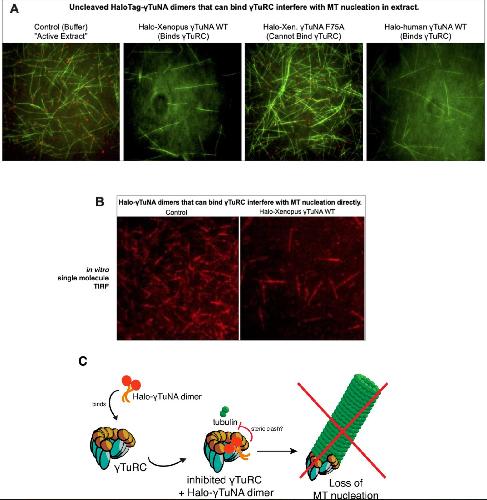 Figure 5—figure supplement 2. The presence of large, bulky N-terminal tags on γTuNA directly inhibits γTuRC activity in extract and in vitro.(A) TIRF assay of Xenopus egg extract in the presence of N-terminally tagged, Halo-γTuNA constructs (wildtype and F75A) after 15 min. Alexa488-tubulin and EB1-mCherry were used to visualize MTs and MT plus-ends. Halo-γTuNA constructs that can bind γTuRC (as determined in Figure 3) drastically decreased the amount of MTs nucleated (human and Xenopus wildtype). Halo-γTuNA F75A mutant, which cannot bind γTuRC, had no effect on MT levels. Images were taken at 18–20°C. Halo-γTuNA was added at 2 µM final. (B) Single molecule TIRF assay of γTuRC-mediated MT nucleation in vitro. After 5 min, γTuRCs alone efficiently nucleate MTs. In the presence of 3.3 µM wildtype Xenopus Halo-γTuNA, few γTuRCs nucleate MTs, indicating a direct inhibition of γTuRC activity. (C) Model for inhibition of γTuRC activity by N-terminal Halo-tagged γTuNA dimers. |