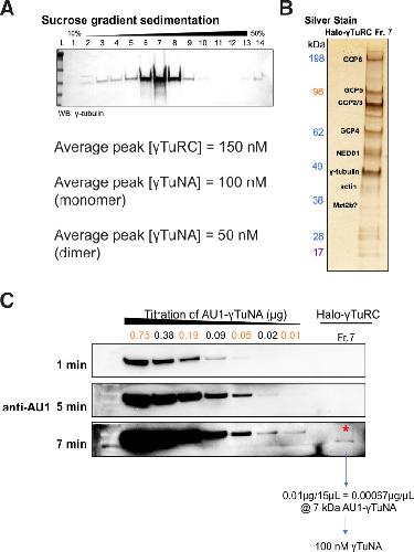 Figure 2—figure supplement 2. Purity and concentration assessment of γTuRCs purified via Halo-γTuNA pulldown.(A) Western blot of γ-tubulin in fractions from a 10% to 50% w/w sucrose gradient. The γTuRC peak was routinely located in fraction 7, as shown in A. Peak γTuRC concentration refers to the peak fraction (usually Fraction 7). This was compared in a western blot against a known titration of recombinant GCP4 to determine [GCP4]. As there are two copies of GCP4 per γTuRC, this meant final [γTuRC] = [GCP4]*0.5. (B) SDS-PAGE and silver stain of the peak γTuRC fraction. Dominant bands are known γTuRC components, as verified by mass spectrometry. (C) Western blot-based determination of γTuNA concentration remaining in γTuRC peak fraction. For this, Halo-γTuRC preps were done with Halo-3C-AU1 reporter tagged versions of human γTuNA. After elution of target protein via PreScission (3 C) cleavage, any remaining γTuNA will still be fused to the AU1 epitope. Probing of the γTuRC peak fraction with a sensitive anti-AU1 antibody (against a titration of known amounts of AU1) allowed us to determine that 100 nM of AU1 remained. This corresponded to 50 nM γTuNA dimer. All raw blots are available in “Figure 2—figure supplement 1—source data 1.”