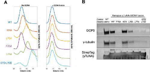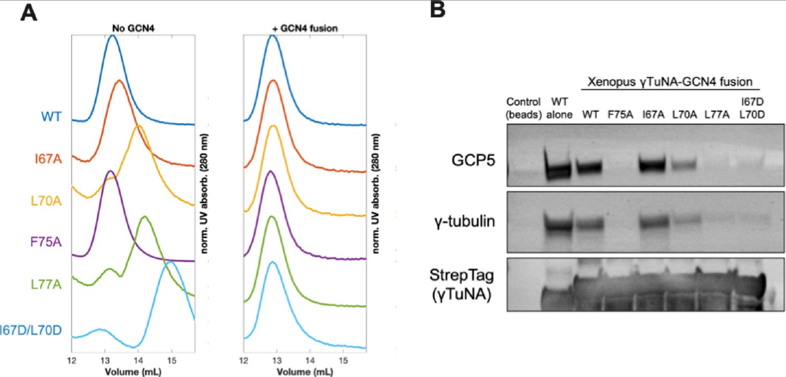 Figure 3—figure supplement 1. Rescuing γTuNA dimerization is not enough to rescue γTuRC binding.(A) Size-exclusion chromatography traces for Xenopus Strep-His-Halo-3C-γTuNA (Halo-γTuNA) or Strep-His-Halo-γTuNA-GCN4 fusion constructs. These constructs were either wildtype or single alanine mutations of residues I67, L70, F75, and L77. Traces were normalized by their maximum peak absorbance and plotted as shown. Proteins were run at 50 µM in a Superdex 200 increase 10/300 GL column (Cytiva) on an Äkta Pure system. (B) Western blot of γTuRC components, GCP5 and γ-tubulin, pulled down from extract by beads coupled to Halo-Xenopus γTuNA wildtype (as a positive control) or Halo-Xenopus γTuNA-GCN4 fusion constructs (wildtype, alanine point mutants, or an aspartate double mutant). StrepTag blot is shown as a bait loading control. Raw blots available in “Figure 3—figure supplement 1—source data 1.”
