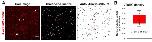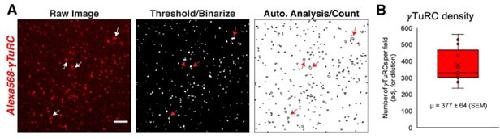 Author response image 1. Analysis of the number of γTuRCs present in the in vitro TIRF assays.(A) Image analysis of fluorescent γTuRC (labeled with NHS-Alexa 568) in an in vitro TIRF assay. Unlike in assays shown in Figure 5, γTuRC was further diluted two-fold with buffer to aid in accurate counting. Images were binarized and counted via ImageJ’s “Analyze Particles” function. Outlines of counted complexes are shown in “A” rightmost panel. Arrows mark complexes that the automatic analysis undercounted as a single γTuRC. Without dilution of γTuRC, this undercounting is worsened and leads to significant error. (B) Quantification of the number of γTuRC spots, corrected for dilution factor. The mean, marked by an “X”, is 377 γTuRCs (±64 SEM). The first to third quartile range (red box) is 302 to 469 γTuRCs. |