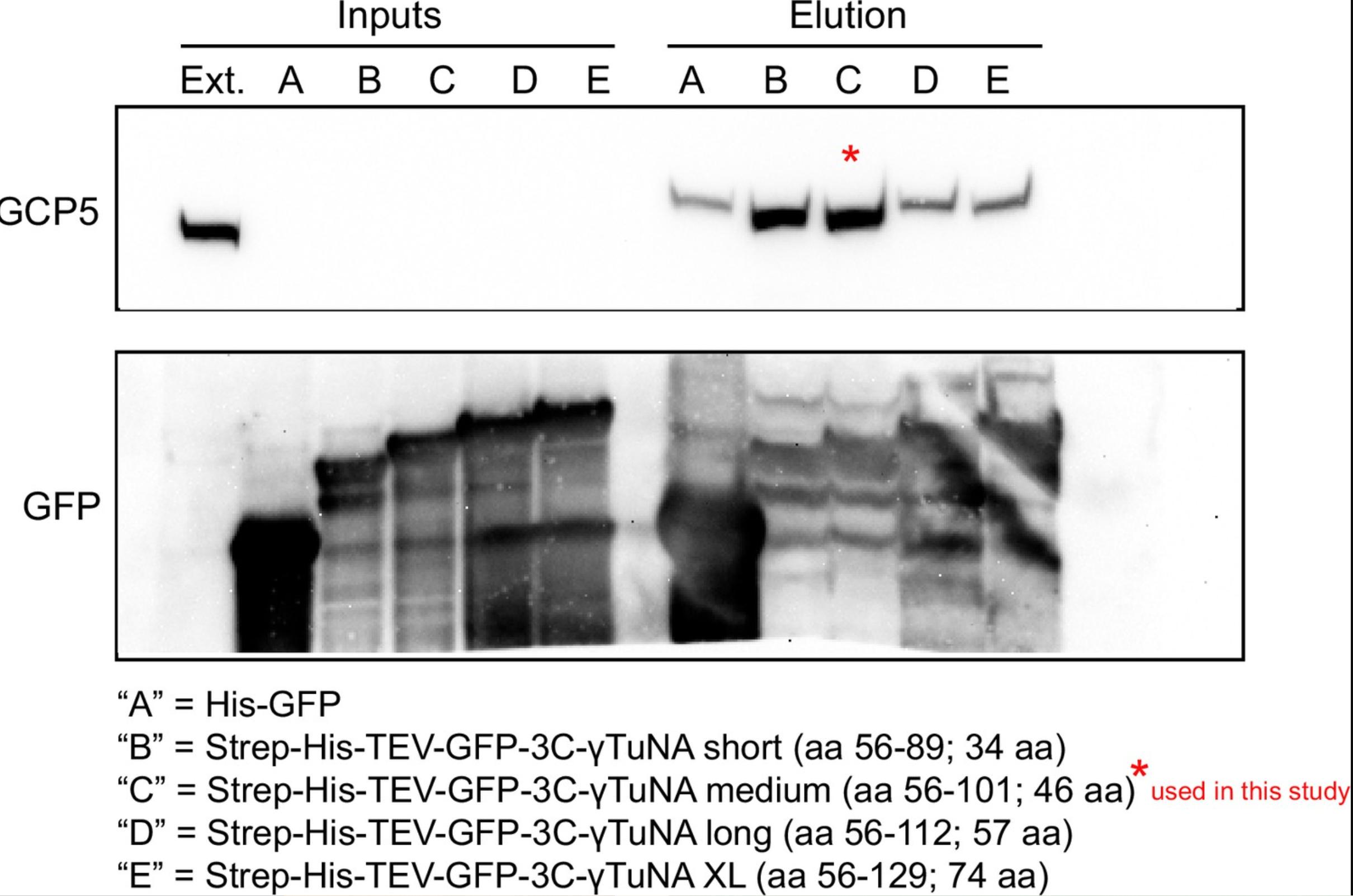 Figure 1—figure supplement 1. Different sizes of Xenopus γTuNA bind γTuRC with different affinities.Western blots of Xenopus egg extract pulldowns with GFP-trap beads (cat # gtma-400, Chromotek) coupled to either GFP control or different lengths of GFP-tagged Xenopus γTuNA. Western blots of GCP5 and GFP were used to assess optimal γTuNA length relative to γTuRC binding ability. From these pulldowns, we determined that N-terminally GFP-tagged Xenopus γTuNAs longer than 46aa appeared to lose γTuRC binding ability. For all subsequent pulldowns in this study, the 46 aa version of wildtype Xenopus γTuNA (aa 56–101) was used fused to an N-terminal Halo-tag. Raw blots are in “Figure 1—figure supplement 1—source data 1.”