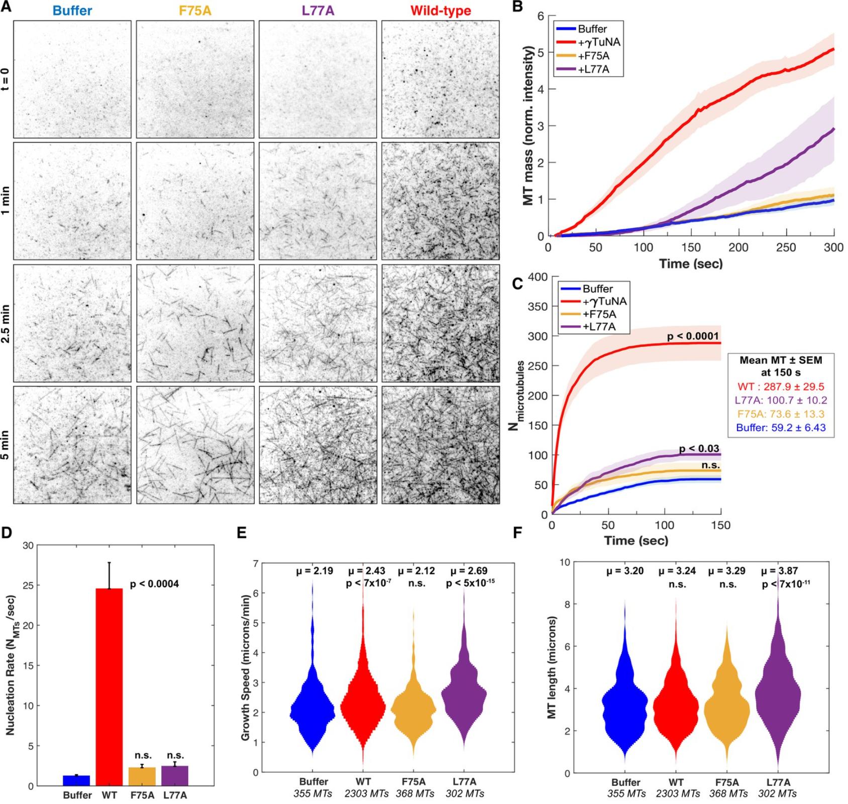 (A) Single molecule TIRF assays of γTuRC-mediated MT nucleation in vitro. Purified Xenopus γTuRCs were biotinylated and attached to passivated coverslips via surface-bound Neutravidin molecules. Polymerization mix containing 15 μM tubulin,1 mM GTP, and either control buffer or 3.3 μM (1.7 μM dimer) Strep-His-Xenopus γTuNA was then added. Wildtype, F75A, and L77A versions of γTuNA were tested. 5% Alexa 568-tubulin was used to visualize MTs. Images were taken every 2 s, for 5 min total, at 33.5 °C. Wildtype γTuNA (n=8), buffer control (n=6), γTuNA-F75A (n=5), and γTuNA-L77A (n=3). (B) Mean MT signal (MT mass) over time, normalized to the buffer condition at 300 s. (C) Mean MT number over time (measured for the first 150 s). The box shows the mean MT number ± SEM at 150 s for each condition. (B and C) Solid lines are the mean over time, with error clouds representing SEM. (D) Initial nucleation rates (Mts nucleated per sec) for each condition (± SEM). The curves shown in part C were fit to an exponential function to determine k (the nucleation rate). Each k was then averaged; see Materials and methods. The following are mean nucleation rate ± SEM. Buffer: 1.2±0.15 MTs/s, WT: 24.5±3.27 MTs/s, F75A: 2.3 ± 0.41 MTs/s, L77A: 2.4±0.55 MTs/s. (E and F) Violin plots of MT growth speeds (in E) or MT lengths (in F) for each condition. Means (μ) are shown alongside p-values. Wildtype γTuNA (n=2303 MTs), buffer control (n=355 MTs), γTuNA-F75A (n=368 MTs), and γTuNA-L77A (n=302 MTs). (C-F) Two-sample unpaired t-tests were used to compare the buffer control to the experimental values. Significance is p<0.05. See “Figure 5—source data 1” for all numerical data presented here. |