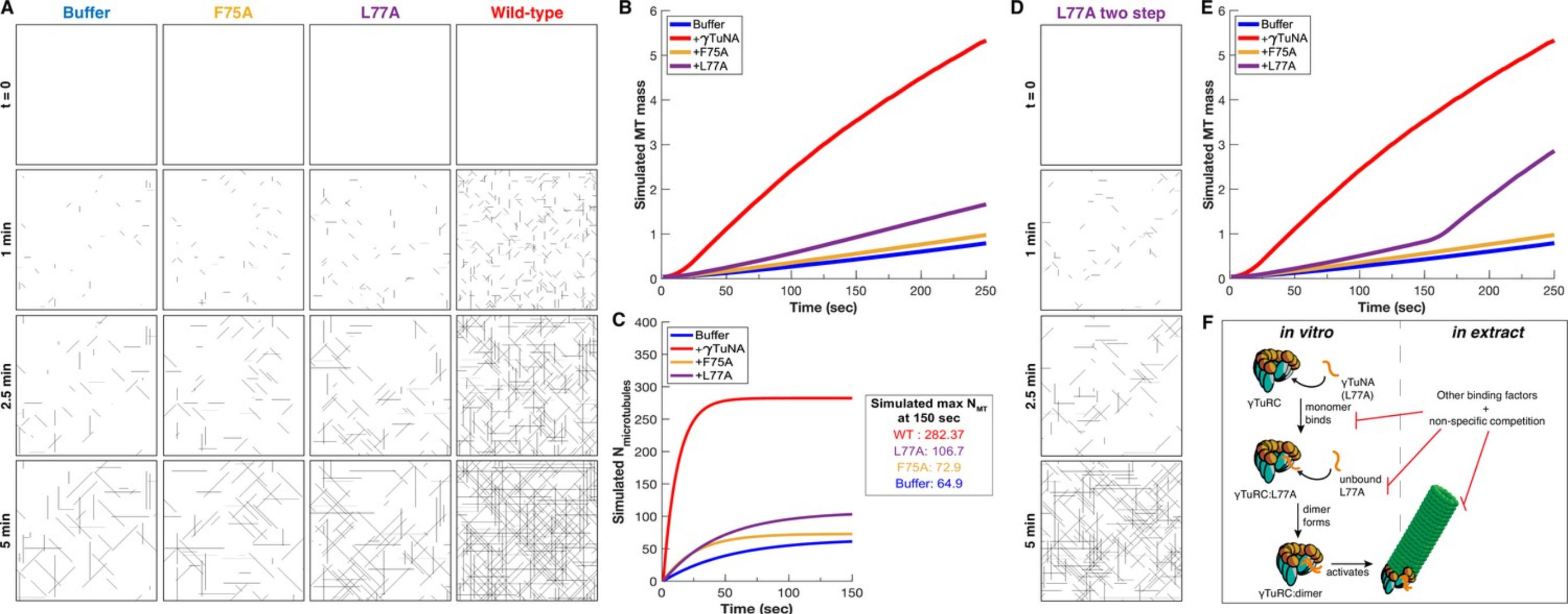 Figure 5—figure supplement 3. Simulation of γTuNA’s effect on γTuRC MT nucleation activity.(A) Simulated frames of MT nucleation and growth (simulated 40x40 µm2 plane) over 5 minutes. Based on just the initial nucleation rate and a single constant growth speed, the simulated data correlates well with the observed data in Figure 5 (see Video 3 for side-by-side comparison). (B) Simulated MT mass over time, measured from simulated movies using the same FIJI (ImageJ) pipeline as used with real data in Figure 5. (C) Simulated number of nucleated MTs over time, with simulated maximum number of MTs at 150 s. (D) Simulated frames of MT nucleation and growth of a two-step model for the L77A mutant. (E) Simulated MT mass over time for the two-step L77A model, now reflecting a late stage increase in MT mass, similar to what was observed in Figure 5B. (F) Model for L77A’s two stage behavior: involving sequential binding of two separate L77A monomers that form a dimer on γTuRC before triggering its activation. In extract, this behavior is not observed, suggesting the presence of other extract factors compete against this interaction. Code used in this figure is available as Source code 1 and Source code 2. |