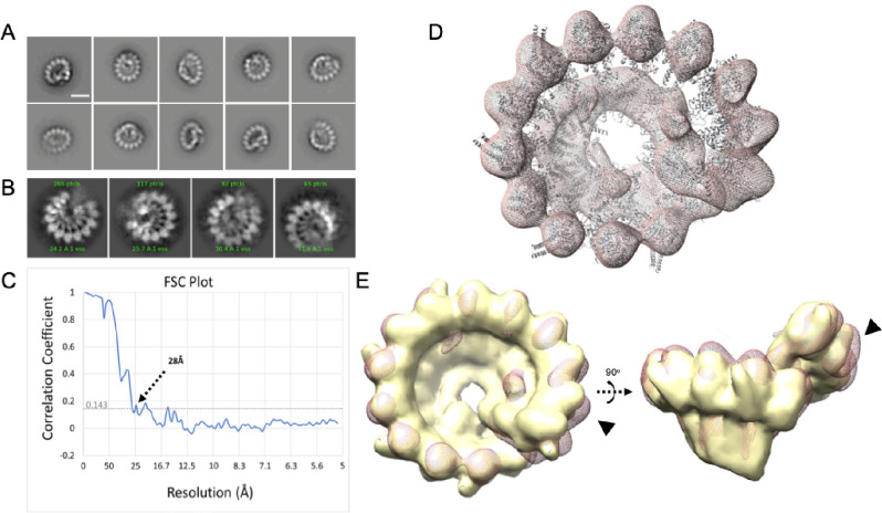 Electron-microscopy data of γTuNA-prepped γTuRC. (A) 2D class averages from 2692 particles isolated from negative-stain data. Scale bar = 20 nm. (B) Selected 2D class averages from 529 particles selected from cryoEM data. (C) Fourier shell correlation (FSC) plot from 3D reconstructions and final refinements of particles of γTuRC from negative-stain EM data, showing a final resolution of 28 Å. (D) Map of γTuNA-prepped γTuRC (red; mesh) with previously published holo-γTuRC structure from Xenopus laevis docked. (E) Overlay of γTuNA-prepped γTuRC with a 28 Å simulated map from the published Xenopus laevis structure of γTuRC (yellow), showing a high correlation between the two (0.89). Highlighted is the area where γTuNA is predicted to bind γTuRC (arrows). Figure made using Chimera. (D and E) Both parts use structure PDB 6TF9 for comparison. |