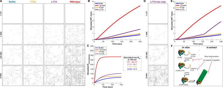 (A) Simulated frames of MT nucleation and growth (simulated 40x40 µm2 plane) over 5 minutes. Based on just the initial nucleation rate and a single constant growth speed, the simulated data correlates well with the observed data in Figure 5 (see Video 3 for side-by-side comparison). (B) Simulated MT mass over time, measured from simulated movies using the same FIJI (ImageJ) pipeline as used with real data in Figure 5. (C) Simulated number of nucleated MTs over time, with simulated maximum number of MTs at 150 s. (D) Simulated frames of MT nucleation and growth of a two-step model for the L77A mutant. (E) Simulated MT mass over time for the two-step L77A model, now reflecting a late stage increase in MT mass, similar to what was observed in Figure 5B. (F) Model for L77A’s two stage behavior: involving sequential binding of two separate L77A monomers that form a dimer on γTuRC before triggering its activation. In extract, this behavior is not observed, suggesting the presence of other extract factors compete against this interaction. Code used in this figure is available as Source code 1 and Source code 2. |