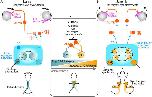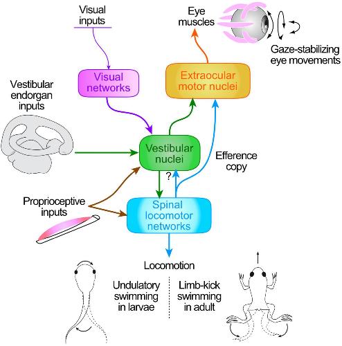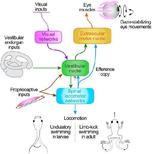 Figure 1. Schematic of central pathways responsible for the transformation of head/body motion-related sensory signals (from visual motion, vestibular endorgans, neck proprioceptors) and ascending motor efference copies (ECs) from spinal locomotor CPG networks into ocular motor commands for gaze stabilization during tail undulatory swimming in Xenopus larvae (bottom left) and limb-kicking propulsion in adults (bottom right). |