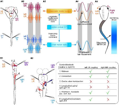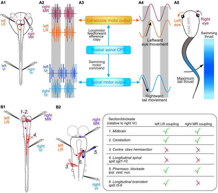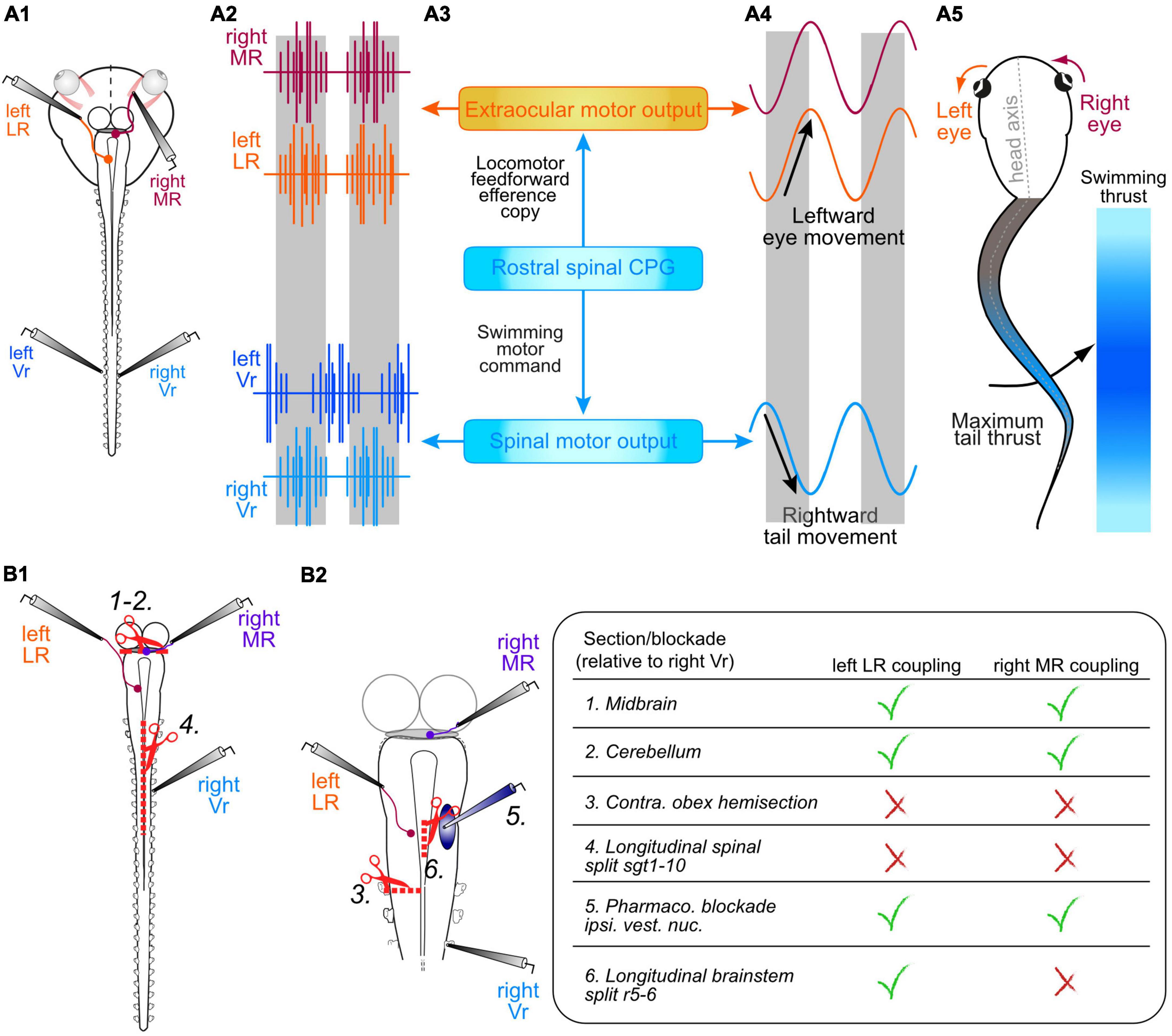Figure 2. Semi-intact preparation of Xenopus larvae for studying the influence of spinal motor network ECs in gaze stabilization during fictive locomotion. (A1–5) Schematic of a head-brainstem-spinal cord preparation (A1) depicting recordings (A2) of a left and right spinal ventral root (Vr, blue traces), a synergistic left lateral rectus (LR, orange trace) and a right medial rectus (MR, red trace) extraocular motor nerve; direct spino-ocular motor connectivity (A3) conveys a copy of swimming motor output from the spinal CPG circuitry to drive compensatory conjugate eye movements during head movements resulting from propulsive bending (A4), mainly of the mid-tail region [indicated by color intensity grading in panel (A5)]. (B1,2) Schematics of the isolated central nervous system (B1) illustrating various surgical lesions and drug application interventions that allowed identifying the ascending pathway from the spinal CPG circuitry to bilateral synergistic sets of LR and MR extraocular motoneurons; 1, 2, disconnection of the midbrain [1 in panel (B1)] and cerebellum [2 in panel (B1)]; 3, hemisection of the brainstem/spinal cord at the level of the obex on the side ipsilateral to a recorded (left) LR nerve (B2) whose burst activity occurred in phase with Vr bursts on the opposite (right) cord side; 4, longitudinal midline split throughout the first 10 spinal segments (B1); 5, injection of glutamatergic transmitter antagonists (CNQX + KYNA) into the vestibular nucleus to block central processing of sensory endorgan signals (B2); 6, midline incision at the level of the abducens nucleus in rhombomere 5 (B2). These interventions and their respective effects on spino-ocular motor coupling to the synergistic left LR and right MR nerves are summarized in the table at right. |