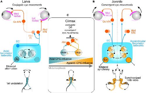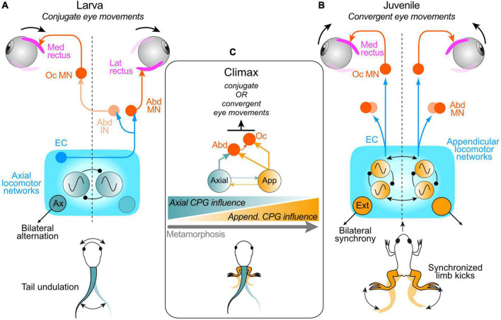Figure 3. Neuronal pathways underlying spino-ocular motor coupling during swimming in pre- and post-metamorphic Xenopus. (A) Schematic depicting the spinal CPG for tail-based propulsion in larvae and pathway connections that convey spinal EC signals to the extraocular motor system; after crossing the spinal cord, ascending projections from the spinal axial CPG network directly drive abducens motoneurons (Abd MN) innervating the lateral rectus (LR) eye muscle on the opposite side and indirectly via abducens internuclear neurons (Abd IN) drive oculomotor motoneurons (Oc MN) innervating the synergistic medial rectus (MR) eye muscle on the same side; this spino-ocular connectivity produces conjugate eye movements during swimming. (B) Schematic depicting the spinal CPG for limb-based rectilinear forward propulsion in juvenile Xenopus and pathway connections with the extraocular motor system; ascending, uncrossed projections from the spinal appendicular locomotor network activate ipsilateral Abd MNs and Oc MNs to produce convergent eye movements during each hindlimb extensor-driven kick cycle. (C) During metamorphic climax, larval and adult CPG circuits co-exist and can be conjointly active, producing a combination of tail- and limb-based propulsion and corresponding EC signals that continuously elicit appropriate conjugate and convergent eye movements; the influence of the appendicular system on ocular motor control progressively increases as the impact of the axial system declines as limb-based locomotion emerges, co-exists with, and eventually replaces tail-based locomotion during metamorphosis (schematized at bottom). |