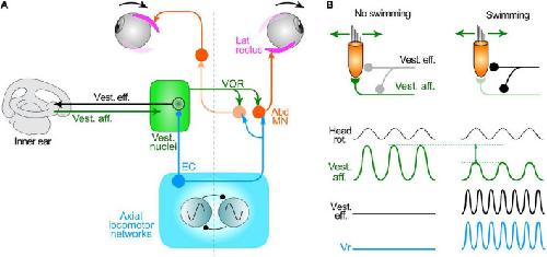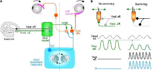 Figure 5. Attenuation of mechanosensory signal encoding in the inner ear during locomotor activity in larval Xenopus. (A) Summary schematic of the circuit elements mediating the vestibulo-ocular reflex (VOR), spino-ocular motor coupling and activation of inner ear vestibular efferent neurons (Vest. eff.) by locomotor ECs. (B) Influence of locomotor activity conveyed by Vest. eff. onto hair cells and vestibular afferent neurons (Vest. aff.); during swimming (right), the overall responsiveness of vest. aff. (magnitude of the sine wave) to imposed cyclic head rotation is substantially reduced compared to the condition without swimming (left). Abd MN, abducens motoneurons; Vr, spinal ventral root. |