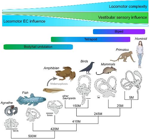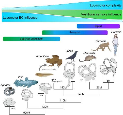Figure 6. Hypothetical evolutionary development of locomotor complexity in vertebrates, the accompanying increase in morphological complexity and the role played by vestibular sensory signaling, and the resultant gradual decline in locomotor EC influence in the production of compensatory eye movements. Despite the increasing capability of inner ear endorgans for motion detection and sensory-motor transformations, locomotor EC signals appear to have maintained an important role in gaze stabilization, even during bipedal locomotion. |