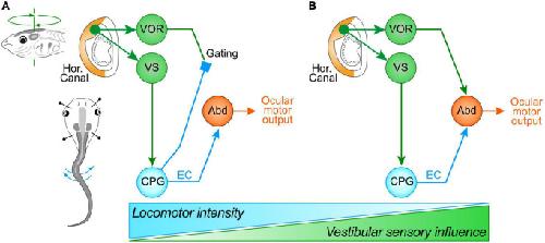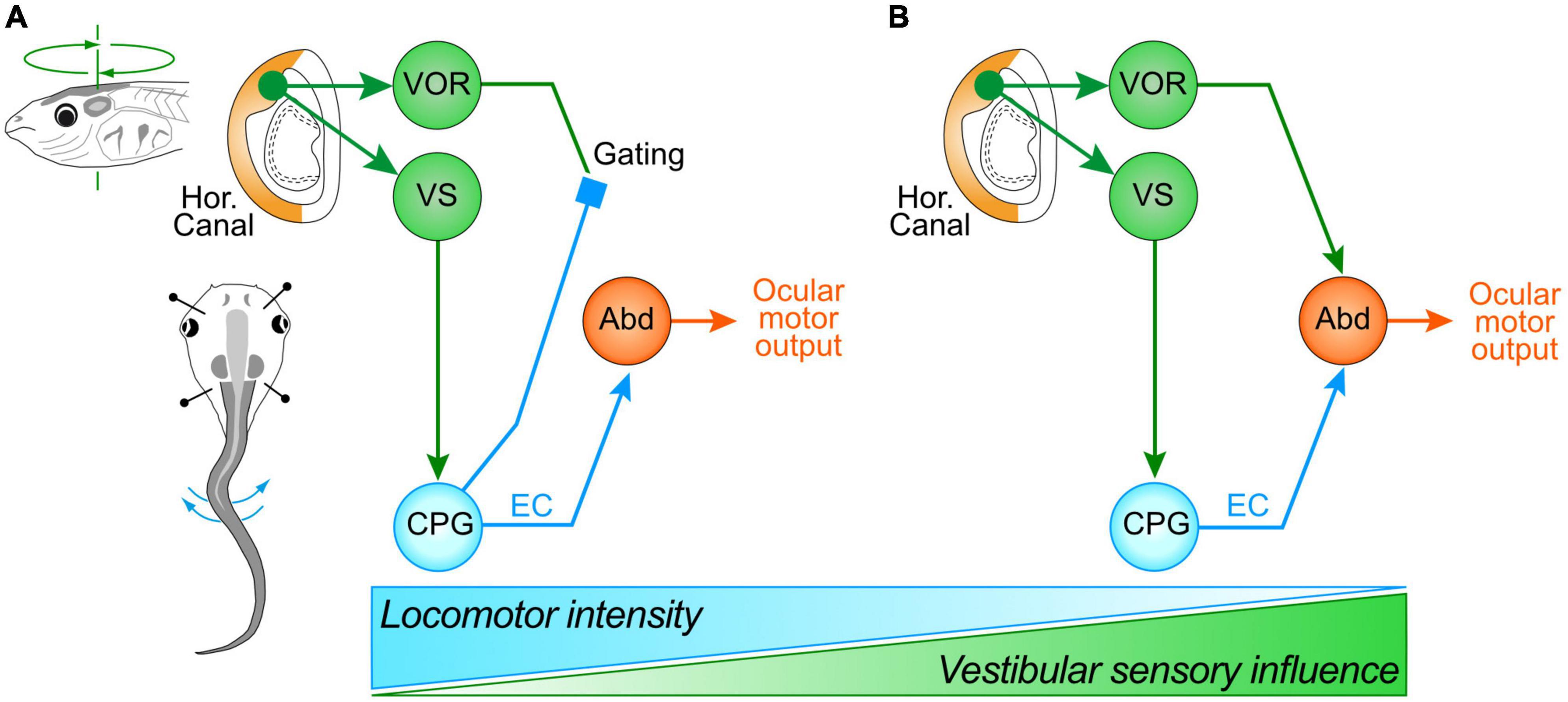 Figure 4. Differential swim intensity-dependent interactions between vestibular sensory signals and locomotor ECs. (A) Schematic depicting the gating of vestibulo-ocular signaling during intense swimming in older larvae or in rapidly-swimming young larvae, leading to ocular motor performance remaining coordinated with tail undulations exclusively through an ascending drive from spinal ECs; during less intense or slow swimming (B), ocular motor performance results from an additive relationship between the predictive ECs and horizontal semicircular canal signals, with the latter now contributing significantly to compensatory eye motion; the two processing configurations gradually change their respective dominance depending on swimming strength and frequency (bottom schematic). Abd, abducens motoneurons; CPG, central pattern generator; VOR, vestibulo-ocular reflex; VS, vestibulo-spinal pathway. |