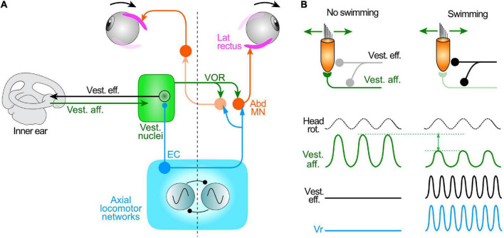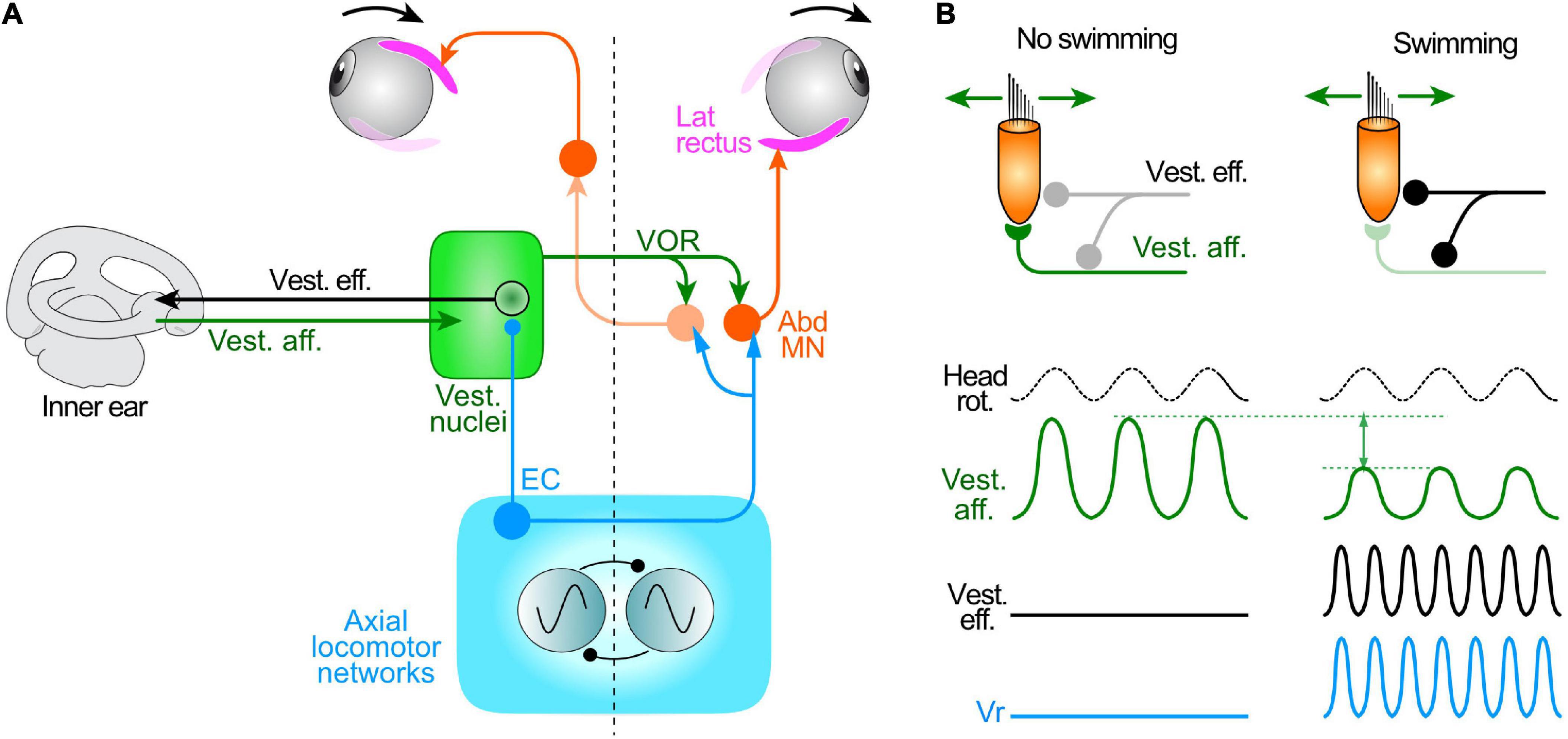 FIGURE 5. Attenuation of mechanosensory signal encoding in the inner ear during locomotor activity in larval Xenopus. (A) Summary schematic of the circuit elements mediating the vestibulo-ocular reflex (VOR), spino-ocular motor coupling and activation of inner ear vestibular efferent neurons (Vest. eff.) by locomotor ECs. (B) Influence of locomotor activity conveyed by Vest. eff. onto hair cells and vestibular afferent neurons (Vest. aff.); during swimming (right), the overall responsiveness of vest. aff. (magnitude of the sine wave) to imposed cyclic head rotation is substantially reduced compared to the condition without swimming (left). Abd MN, abducens motoneurons; Vr, spinal ventral root. |