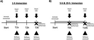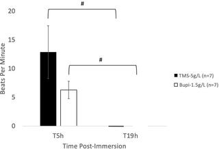 Immersion in tricaine methanesulfonate (i.e. TMS) has been used for euthanasia of Xenopus laevis (African Clawed frogs). However, the time for preparation and potential human health hazards may pose as a barrier for large group culls. Here, we aimed to investigate whether immersion in bupivacaine is an effective means to euthanize this species. In experiment one, frogs (n = 10/group) were randomly assigned to 1-h immersion in 1 of 3 treatment groups: 1) TMS-5 (MS-222, 5g/L); 2) TMS-10 (MS-222, 10 g/L); or 3) Bupi-1.5 (0.5% Bupivacaine, 1.5 g/L). Frogs were then removed from solutions, rinsed with system water, and placed into a recovery cage. Heart rate was evaluated audibly via doppler ultrasound flow over 1 min at immediate removal (T1h), at 2 (T2h), and 3 (T3h) h in the recovery cage. In experiment two, frogs (n = 7/group) underwent 5-h & 19-h immersion in either TMS-5 or Bupi-1.5, with heart rate assessment at 5 and 19 hrs. Righting reflex and withdrawal reflex of the hindlimb were tested during the experiments. Experiment one-after the 1-h immersion, Bupi-1.5 treated animals had decreased heart rates compared to TMS-5 and TMS-10 treated animals by T2h. Neither TMS-5, TMS-10, nor Bupi-1.5 ceased heart rate after the 1-h immersion. Experiment two-after the 5-h immersion, Bupi-1.5 and TMS-5 treated animals were comparable in heart rates. 43% of TMS-5 animals and 14% of the Bupi-1.5 animals had completely ceased heart rates at T5h. At 19 h all remaining animals exhibited rigor mortis and had ceased heart rate. We recommend 19-h of immersion using either TMS-5 or Bupi-1.5 for cessation of heart rate in African Clawed frogs. These data are strong support for the use of secondary physical methods for euthanasia in African Clawed frogs when euthanasia by immersion is performed.