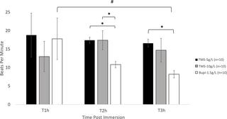 Heart rate (bpm; mean ± SEM) detected audibly via doppler ultrasound flow evaluation. * values are significantly different (P < 0.05) from each other. # values are significantly different (P < 0.05) between time points.