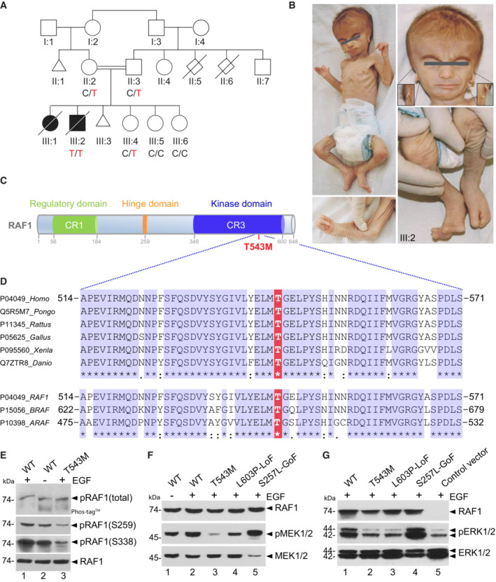 Somatic and germline gain-of-function point mutations in RAF, one of the first oncogenes to be discovered in humans, delineate a group of tumor-prone syndromes known as the RASopathies. In this study, we document the first human phenotype resulting from the germline loss-of-function of the proto-oncogene RAF1 (a.k.a. CRAF). In a consanguineous family, we uncovered a homozygous p.Thr543Met variant segregating with a neonatal lethal syndrome with cutaneous, craniofacial, cardiac, and limb anomalies. Structure-based prediction and functional tests using human knock-in cells showed that threonine 543 is essential to: (i) ensure RAF1's stability and phosphorylation, (ii) maintain its kinase activity toward substrates of the MAPK pathway, and (iii) protect from stress-induced apoptosis mediated by ASK1. In Xenopus embryos, mutant RAF1T543M failed to phenocopy the effects of normal and overactive FGF/MAPK signaling, confirming its hypomorphic activity. Collectively, our data disclose the genetic and molecular etiology of a novel lethal syndrome with progeroid features, highlighting the importance of RTK signaling for human development and homeostasis.