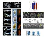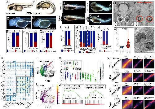 Figure 3. Reduction of TRAF7 causes ciliopathy phenotypes in zebrafish (AG) and Xenopus tropicalis (HR), and single-cell transcriptomic analysis reveals TRAF7 association with cilia-related genes (SV). (A and B) Pronephric cysts and axial curvature in 2.5 dpf Traf7 morphant zebrafish larva (A) but not control. (B). Embryos exhibit substantial ventrally directed curling and cysts that appear as small spherical clearings in the pronephros (arrowhead). (C and D) Hydrocephalus in 2 dpf embryos following injection of TRAF7 splice-site (R), but not control (Q), MO at the 1-cell stage. Quantification of embryos presenting with hydrocephalus (S) ****: P < 0.0001 (two-sided Fishers exact test, n= # of embryos). (E) Quantification of curled-down phenotype. This occurs in ~75% of MO-injected embryos, but never in controls. ****: P < 0.0001 (two-sided Fishers exact test, n= # of embryos). (F) Quantification of cystic phenotype. This appears in ~33% of MO-injected embryos, but never in controls. ****: P < 0.0001 (two-sided Fishers exact test, n= # of embryos). (G) Quantification of hydrocephalus phenotype. This appears ~75% of the time in injected fish, but never in uninjected controls. ****: P < 0.0001 (two-sided Fishers exact test, n= # of embryos). ( HN) Hydrocephalus and cranial (arrowheads) and tail (arrows) defects in 2 dpf (stage 38-39) in X. tropicalis embryos injected with translational (I) but not control (H) MO, or with CRISPR/Cas9 targeting TRAF7 (K), but not Cas9 alone (J). Scale bar: 200 m. (L) Quantification of curled tail phenotype. This appears in ~47% of MO-injected embryos, but never in controls. ****: P < 0.0001 (two-sided Fishers exact test, n = # of embryos); (M) Quantification of hydrocephalus/cranial defect phenotype. This appears in embryos injected with translational morpholino (~30%) and splice-site morpholino (~25%), but never in embryos injected with control morpholino. CRISPR2 injections are more effective (~25%) than CRISPR 1 (~12%) as compared to CAS9 in eliciting cranial defect phenotype. ****: P < 0.0001 (two-sided Fishers exact test, n= # of embryos); (N) Rescue of cranial defects upon coinjection of 100 pg of WT-TRAF7 mRNA and splice-site TRAF7-MO. n = number of embryos. ***: P < 0.001 (two-sided Fishers exact test, n = # of embryos). (OR) Traf7 morphant (P) but not control (O) X. tropicalis embryos exhibit enlarged kidneys at 5 dpf as visualized by OCT; (Q) Quantification of kidney size: TRAF7 morphant embryos show a variable but overall significant increase in kidney size as compared to control embryos (Movie S5). ****: P < 0.0001 (two-sided Fishers exact test, n= # of embryos); ( R) Transmission electron microscopic analysis of the developing pronephros at 5 dpf shows large vesicular bodies suggestive of precystic kidneys. (SX) scRNAseq analysis of E14.5 mouse meninges obtained from publicly available data (25). Dot plot showing mean expression for marker genes for the arachnoid, dura, pia, and proliferating cell clusters. The size and color density of the dots represent fraction of cells expressing the gene in the groups and mean expression, respectively. Shaded rectangles indicate genes enriched in cell clusters. * Indicating the relative expression of Traf7 within cell clusters (S). PHATE plot showing different cell clusters in scRNAseq data in (S). Colors representing cell clusters [see panel V] (T). PHATE plot demonstrating Traf7 expression profile in mouse meningeal cell clusters (U). Jitter plot showing enrichment of Traf7 in proliferating meningeal cluster, more prominently in Proliferating-2 subcluster (V). Gene set enrichment analysis (GSEA) indicating the enrichment of cilia-related genes (obtained from CiliaCarta Database) within the genes that show positive (Left) or negative (Right) association with Traf7 expression in knn-DREMI analysis. Positively associated genes demonstrating significant enrichment for cilia-related genes, while negatively associated genes do not. NES: Normalized enrichment score (W). Representative DREVI plots for the cilia-related genes showing strong positive relationship with Traf7 expression in knn-DREMI analysis (X). |
