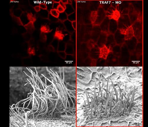 Movie S6. Xenopus epidermal multiciliated cells labelled with mRFP and imaged with high-speed confocal microscopy. TRAF7 morphant tadpoles display shorter and non-motile multiciliated cells. The tadpoles following real-time imaging recovered and processed for SEM. Below, SEM imaging displays shorter MCCs in TRAF7 morphants compared to controls. |