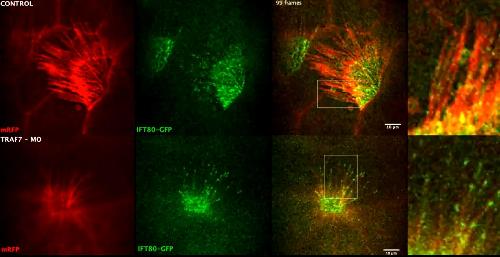 Movie S18. IFT57 transport in TRAF7 morphant Xenopus embryos. Two-channel high-speed confocal imaging shows the intraciliary IFT43 trafficking in Xenopus epidermal MCCs is altered when TRAF7 is depleted. |