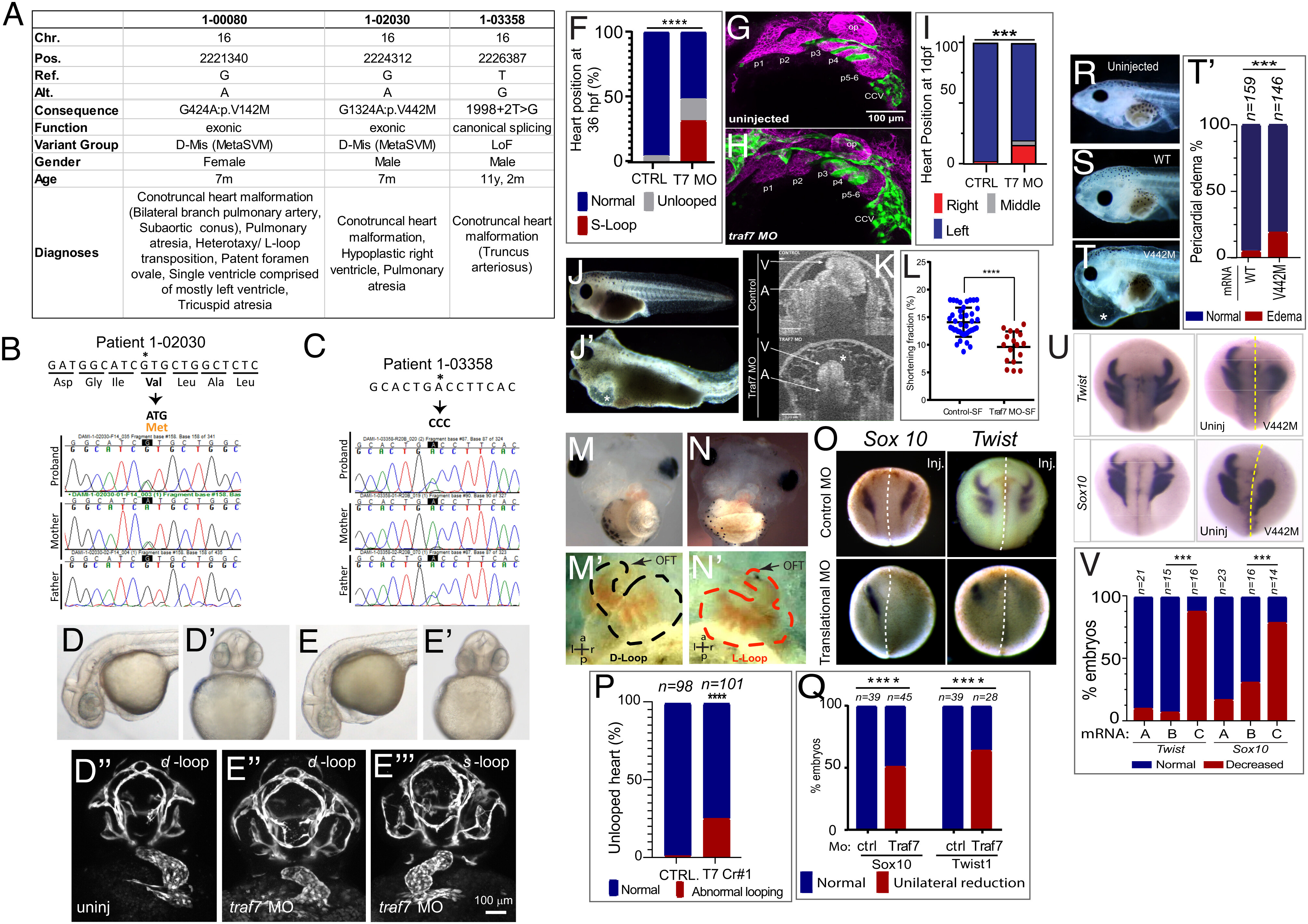 Figure 2. TRAF7 mutations cause congenital heart defects: reduction of TRAF7 in zebrafish (D–H) and Xenopus tropicalis (I–P) as well as overexpression of mutant TRAF7 in X. tropicalis causes developmental defects (Q–U). (A) Clinical manifestations of patients harboring inherited TRAF7 heterozygous developmental mutations. (B and C). Sanger sequencing traces of patients 1-02030 and 1-03358 and their clinically unaffected parents. The mutations are indicated in bold, and asterisk marks the mutated residue. (D–F) Injection of control (D–D’’) or splice-site (E–E’’’) TRAF7 MO in tg(kdrl:GFP;gata-1:dsRed) embryos results in pronounced heart looping defects at 36 hpf. (F). Quantification of embryos displaying cardiac looping defect ****: P < 0.0001 (Fisher’s exact test; n= # of embryos). (G and H). Traf7 morphants exhibit reduced sox10 expression, disorganized pharyngeal arches. (H) Uninjected zebrafish (Tg:kdr:GFP, sox10:mRFP) embryo at 30 hpf showing pharyngeal arches 1 to 6 (p1 to p6). The otic placode (op) and common cardinal vein (CCV) are also labeled. (I) TRAF7 morphant at the same stage. Note the reduced size of the pharyngeal arches, disorganization of p3 to p6, and reduced Sox10 expression. Green channel: endothelial cells; magenta: Sox10-expressing cells. (I) Distribution of heart position in control and TRAF7 1-d postfertilization morphants. Control: Left = 97.29% ± 3.29; middle= 0.83% ± 1.67; right= 1.88 ± 2.19, from 112 embryos total. TRAF7: Left = 76.31% ± 9.32; Middle = 3.07% ± 5.10; Right = 20.62 ± 9.99, from 112 embryos total. Two-way ANOVA with Bonferroni’s multiple-comparison test, P = 0.0004 for left heart position. J−K. Injection of control (J) or splice-site (J’) TRAF7 MO in one-cell stage Xenopus embryos results in extensive pericardial edema (asterisk). Optical coherence tomography (OCT) highlights the edema (asterisk) and malformed heart (K), reflected in a significant reduction of the shortening fraction (L) at 3 dpf (stage 46) (Movie S3). Mann–Whitney test (scatter plot mean ± SD; n = 17, TRAF7 splice-site MO injected; n = 41, control MO injected.) M–N’ TRAF7 CRISPR (CR#1) injection in one-cell stage Xenopus embryos results in pronounced heart looping defects at 48 hpf (N, N’) as compared to controls (M, M’) (Movie S4). OFT: outflow tract, V: ventricle. O. In situ hybridization analysis of Xenopus embryos (stage 16 to 18, 15 hpf): Unilateral injection (Inj.) with splice-site TRAF7, MO at two-cell stage shows disrupted expression of neural crest markers Sox10 and Twist on the injected side when compared to the internal uninjected control. (P) Quantification of embryos displaying cardiac looping ****: P < 0.0001 (Fisher’s exact test; n= # of embryos). ( Q) Quantification of control or TRAF7 splice-site MO-injected embryos analyzed for Sox10 and Twist expression. n = number of embryos. ****: P < 0.0001 (Fisher’s exact test; n = # of embryos). (R–T’) Severe pericardial edema in Xenopus embryos following injection of TRAF7 mRNA encoding mutant form V442M (T) but not WT (S) as compared to uninjected embryos (R). Quantification of embryos displaying pericardial edema (T’), ***: P < 0.001 (Fisher's exact test, n = # of embryos). (U) In situ hybridization analysis of Xenopus embryos (stage 17, 18 hpf): Decreased expression of the neural crest markers Twist and Sox10 following unilateral injection of TRAF7 V442M mRNA at the 2-cell-stage. (V). Quantification of control or TRAF7 splice-site MO-injected embryos analyzed for Sox10 and Twist expression. A = Control, B = WT TRAF7, C = V442M TRAF7. ***:P < 0.001: Pairwise Fisher’s exact test with FDR correction, n = # of embryos. |