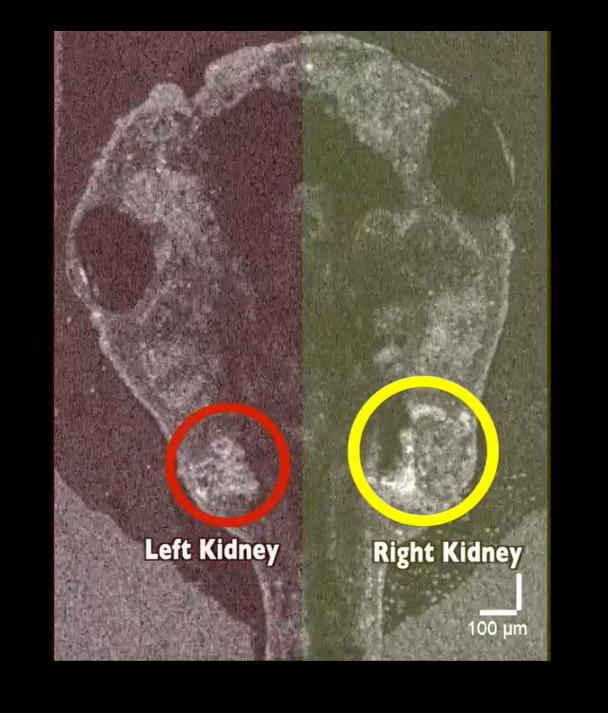Still from Movie S5. Dorsal-Ventral optical scanning of the stage 46 Xenopus tadpole by OCT imaging shows enlarged, cystic kidney at the TRAF7 depleted side compared to the control-uninjected side. |