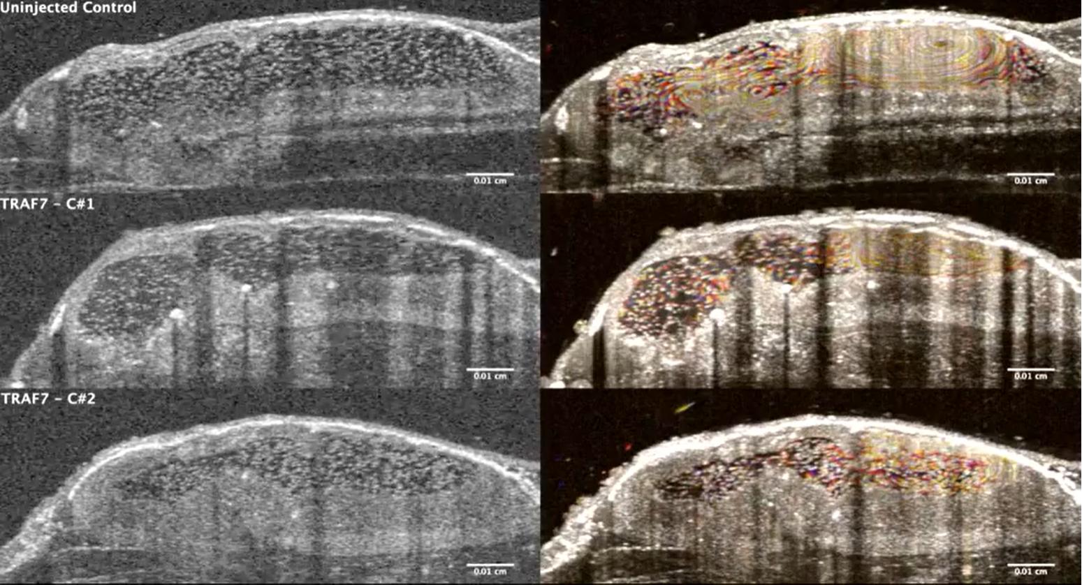 Movie S13. OCT imaging of the Xenopus (stage 46) brain. Mid-sagittal imaging plane shows the ventricular space where CSF circulates via ependymal motile cilia. Right column shows particle heat map averaged over 100 frames. TRAF7 mutant tadpoles show reduced cilia-driven CSF circulation compared to controls. |