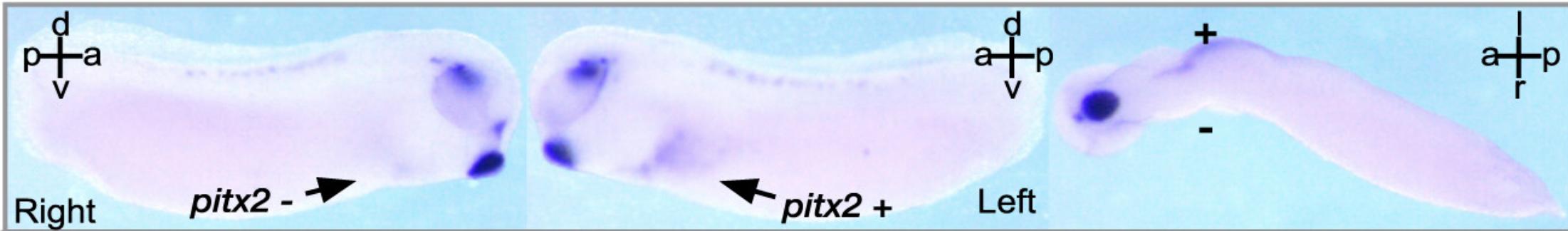 pitx2 (paired like homeodomain 2) gene expression in X. tropicalis embryo, assayed via in situ hybridization at NF stage 28, lateral view of right and left sides of body, dorsal up, and ventrally with anterior left. |