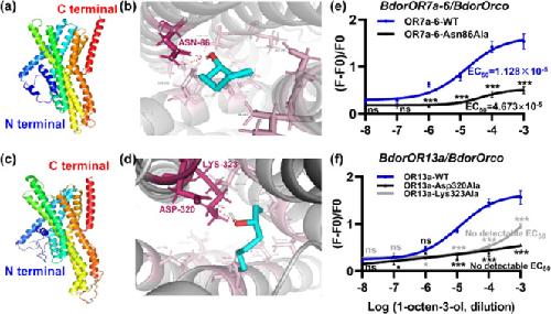 Fig. 5. Molecular docking of BdorOR7a-6 and BdorOR13a to 1-octen-3-ol, and site-directed mutagenesis to confirm the essential residues.a Structure of BdorOR7a-6 predicted using AlphaFold 2.0. b Residue of BdorOR7a-6 required for binding to 1-octen-3-ol. c Structure of BdorOR13a predicted using AlphaFold 2.0. d Residues of BdorOR13a required for binding to 1-octen-3-ol. e Response of BdorOR7a-6 Asn86Ala mutant to 1-octen-3-ol based on calcium imaging. f Responses of BdorOR13a Asp320Ala and Lys323Ala mutants to 1-octen-3-ol based on calcium imaging.