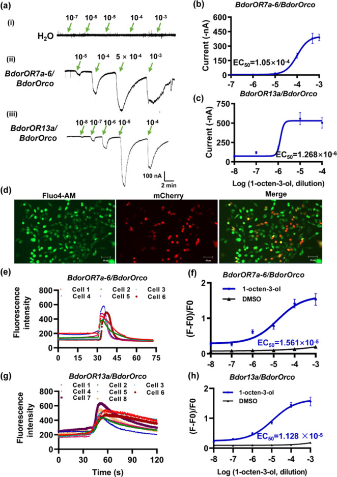 Xenopus oocytes were injected with the appropriate constructs and stimulated with 1-octen-3-ol at different concentrations. The oocytes were injected with (i) water as a control, (ii) cRNA of BdorOR7a-6/BdorOrco, (iii) cRNA of BdorOR13a/BdorOrco. b Dose-response curve of BdorOR7a-6 to 1-octen-3-ol. EC50 = 1.05 × 10−4 M. c Dose-response curve of BdorOR13a to 1-octen-3-ol. EC50 = 1.268 × 10−6 M. Symbols show the current responses from the BdorOR/BdorOrco complex presented as means ± SE (n = 8). The dose–response curves were fitted using GraphPad 8.0. d–h Responses to 1-octen-3-ol of HEK 293 cells co-expressing BdorOR7a-6/BdorOrco or BdorOR13a/BdorOrco. d Fluorescence images of HEK 293 cells incubated with Fluo4-AM and transfected with the candidate OR genes. Fluo4-AM was used to indicate the fluorescence change (ΔF) over time, and mCherry was used as the reporter to observe the successfully transfected cells. The proportional scale is 50 μm. e Change in fluorescence intensity of cells expressing BdorOR7a-6/BdorOrco following stimulation with 10−4 M of 1-octen-3-ol. f Dose–response curve of BdorOR7a-6 to 1-octen-3-ol. EC50 = 1.561 × 10−5 M. g Change of fluorescence intensity of cells expressing BdorOR13a/BdorOrco following stimulation with 10−4 M of 1-octen-3-ol. h Dose–response curve of BdorOR13a to 1-octen-3-ol. EC50 = 1.128 × 10−5 M.