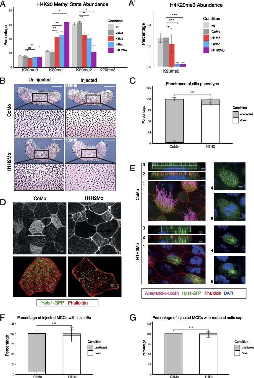 (A, A’) Relative abundance of H4K20 methyl states by mass spectrometry in X. laevis bulk embryonic chromatin upon control (CoMo), single or double KD of SUV4-20H1 and SUV4-20H2 enzymes. (B, C) Representative immunocytochemistry images of multiciliated cells (acetylated a-tubulin) in a tail bud stage embryo upon control or SUV4-20H dKD (inserts show enlarged sections of the same images, scale bars = 1 mm) and (C) quantification of (B) (n = 6 biological replicates). (D, E) Representative immunofluorescence images detailing the multiciliated cell phenotype upon suv4-20h1/2 KD. Basal bodies are green (hyls1-GFP), the cilia are magenta (acetylated a-tubulin antibody), the apical actin meshwork is red (phalloidin) and the nucleus is blue (DAPI). (E) Confocal analysis of the actin meshwork and docked basal bodies in CoMo or H1H2Mo-injected MCC. Panels show: 1—a representative MCC, 2—overlap between the actin cap and basal bodies on the apical surface, 3—basal bodies in only the uppermost Z-sections, 4—an apical view of the basal bodies, 5—a deep Z-section close to the cell nucleus. (F, G) Quantification of the number of MCCs showing reduced cilia and filamentous actin staining after confocal analysis. We measured 144 CoMo and 163 H1H2Mo-injected multiciliated cells. Error bars represent standard deviations. |