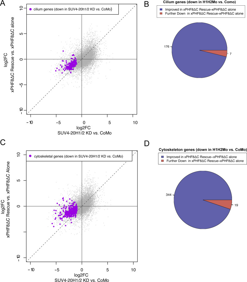 Figure S6. Transcriptomic analysis of xPHF8ΔC rescue in SUV4-20H morphant ACs.(A, C) To investigate whether transcript levels of cilium and cytoskeleton genes, which were down in the initial SUV4-20H1/2 KD dataset, had improved, we compare the log2fold change between H1H2Mo versus CoMo-injected animal caps with log2 fold change of xPHF8ΔC rescue versus xPHF8ΔC alone injected animal caps for cilium (A) and cytoskeleton (C) genes. Dashed line indicates no difference in expression upon xPHF8ΔC rescue. Genes above the line have improved expression and genes below the line are further down-regulated. (B, D) Change in expression of cilium (B) and cytoskeleton genes (D) that were down-regulated by SUV4-20H1/2 KD upon xPHF8ΔC rescue. |