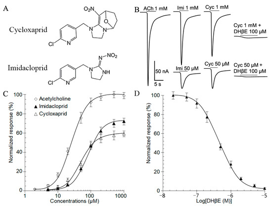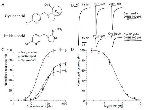 Figure 1. Cycloxaprid acted on recombinant receptor Nlα1/β2 in Xenopus oocytes as a full agonist. (A) Chemical structures of cycloxaprid and imidacloprid. (B) Representative currents elicited by acetylcholine, imidacloprid, and cycloxaprid on recombinant receptor Nlα1/β2 expressed in Xenopus oocytes. The concentrations (µM) were provided above the currents following drug name, acetylcholine (ACh), imidacloprid (Imi), and cycloxaprid (Cyc). (C) Concentration-response curve for inward currents induced by acetylcholine (n = 7), imidacloprid (n = 6), and cycloxaprid (n = 12). The currents were normalized to the maximum currents elicited by 1000 µM acetylcholine and presented as mean ± SEM. (D) The dose-inhibition relationship for hybrid receptor Nlα1/β2 (n = 11). The curve was obtained by perfusing oocytes with increasing concentrations of the antagonist DHβE for 30 s prior to application of 1000 µM cycloxaprid in the continued presence of the antagonist for 10 s. The data were normalized to the response of each oocyte to 1000 µM cycloxaprid and presented as mean ± SEM.