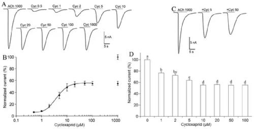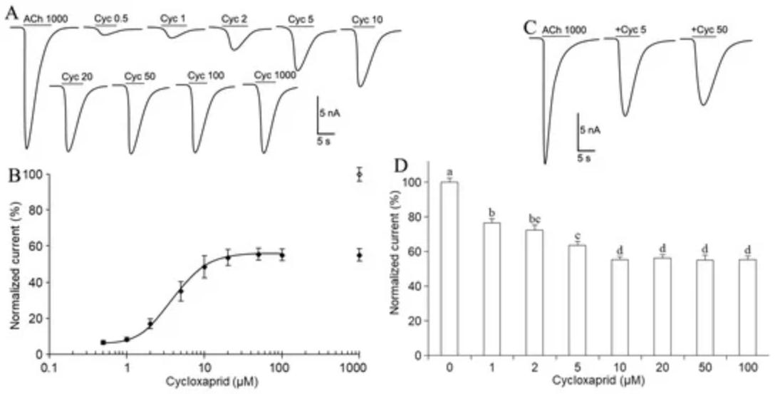 Figure 3. Cycloxaprid acted on cockroach DUM neurons as a partial agonist. (A) Representative currents elicited by acetylcholine and cycloxaprid on cockroach DUM neurons. The concentrations (µM) were provided above the currents following drug name, acetylcholine (ACh), and cycloxaprid (Cyc). (B) Concentration-response curve for inward currents induced by cycloxaprid (n = 12). The currents were normalized to the maximum currents elicited by 1000 µM ACh, as indicated by the blank diamond (◊). A separate filled diamond (♦) showed the normalized currents from 1000 µM Cyc. (C) Representative currents elicited by the application of ACh and co-application of ACh and Cyc on cockroach neurons (n = 15). Concentrations were provided following drug names. + meant ACh plus Cyc. (D) Cyc concentration-dependent inhibition on inward currents elicited by 1000 µM ACh on cockroach neurons (n = 14–20). The currents were normalized to the maximum currents elicited by 1000 µM ACh. Data were presented as mean ± SEM. We performed one-way ANOVA with Tukey’s multiple comparisons. Different letters indicated significant differences at 0.05 level.