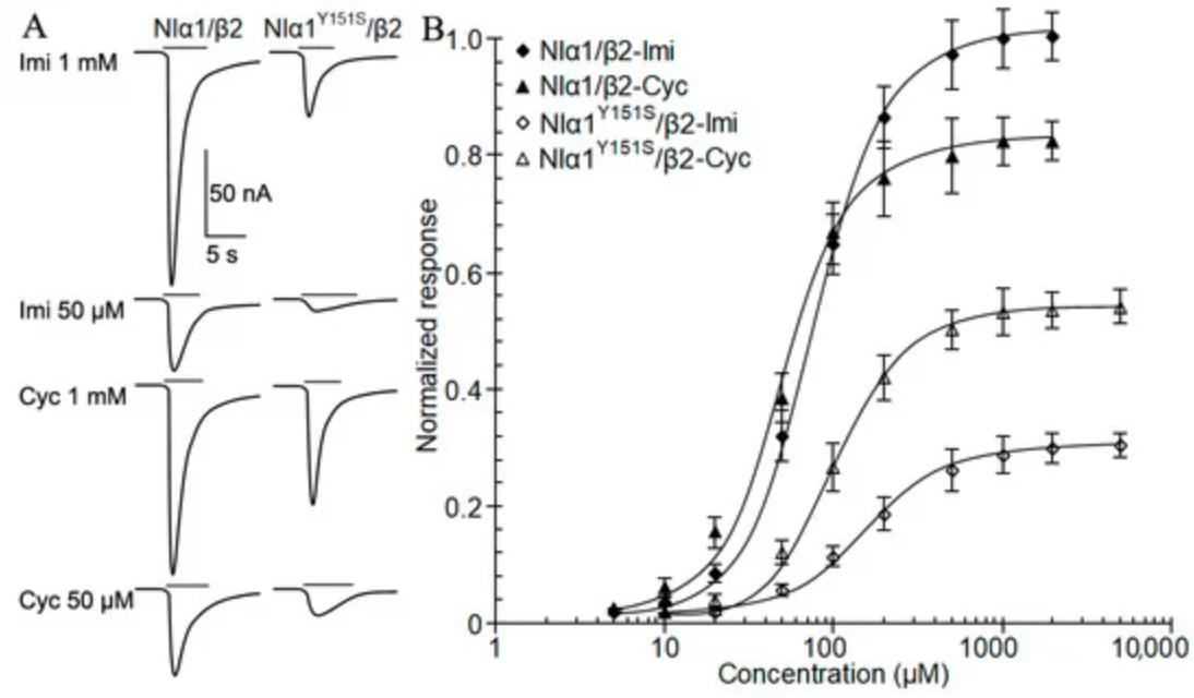 Figure 2. Effects of Y151S mutation on agonist potency on the receptor Nlα1Y151S/β2. (A) Representative currents elicited by imidacloprid and cycloxaprid on wildtype receptor Nlα1/β2 (left) and mutant receptor Nlα1Y151S/β2 (right). The concentrations (µM) were provided following drug name, imidacloprid (Imi) and cycloxaprid (Cyc). (B) Concentration-response curve for inward currents induced by imidacloprid and cycloxaprid (n = 6–12). The currents were normalized to the maximum currents elicited by 1000 µM imidacloprid on the wildtype receptor Nlα1/β2. Data were presented as mean ± SEM.