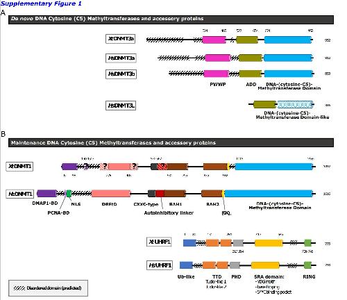 Supplementary Figure 1: Comparison of DNA methyltransferases and main accessory proteins from H. sapiens (Hs) and X. tropicalis (Xt). (A) De novo DNA methyltransferases: XtDNMT3a (accession number F7BU15), HsDNMT3a (Q9Y6K1), HsDNMT3b (Q9UBC3), and HsDNMT3L (Q9UJW3). PWWP domain: Pro-TrpTrp-Pro motif (fuchsia) ; ADD domain: ATRX-DNMT3-DNMT3L, comprised of an N-terminal C2C2-type zinc finger (GATA-like), an imperfect PHD-type C4C4 zinc finger PHD finger and a C-terminal α-helix (olive). DNA-(cytosine-C5)-Methyltransferase Domain: catalytic domain (light blue). DNA-(cytosine-C5)-Methyltransferase Domain – like: inactive methyltransferase domain in DNMT3L (white with light blue zig-zags).(B) Maintenance DNA methyltransferases: XtDNMT1 (F6QE78); HsDNMT1 (P26358); XtUHRF1 (F6UA42); HsUHRF1 (Q96T88). DMAP1-BD: interaction module that binds the