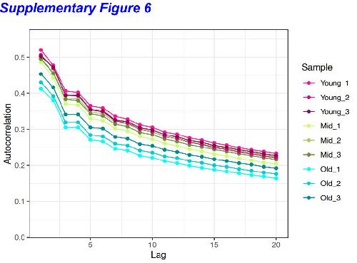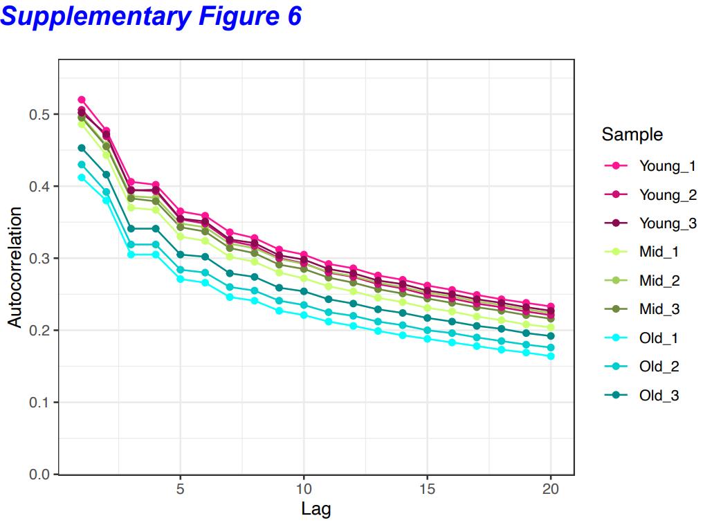 Supplementary Figure 6: Autocorrelation of CpG DNA methylation for the closest 20 CpG sites (Lag). Lag =0 (the site itself) has been omitted for all samples (r =1).