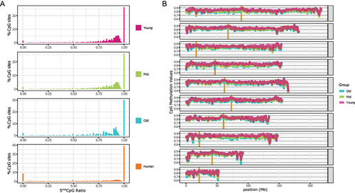 (B) CpG methylation distribution over chromosomes for each age group (average of all samples within the same group). Vertical gold bars represent centromere positions. Common sites for all samples with at least 3× coverage were used. Resolution 500Kb.