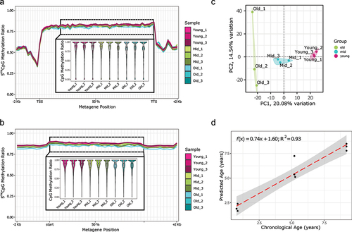 (D) CpG methylation preliminary clock leave-one-out predictions. Each point represents the age prediction on one sample from an elastic net model which was trained on the other eight samples. For all panels, common sites for all samples with at least 5× coverage were used. The boxplots in the insets show the mean of the distribution.