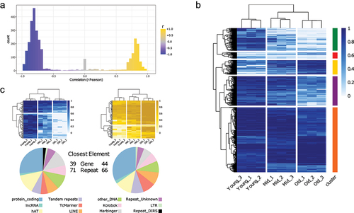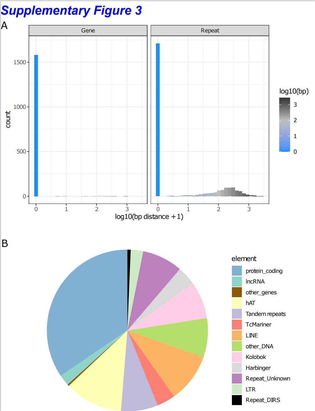 Supplementary Figure 3: (A) Distribution of distances between selected regions (refer to Supplementary Table 3) and genome elements: genes (left) and repeats (right). (B) Distribution of the closest genomic elements (both genes and repeats) for each selected region.