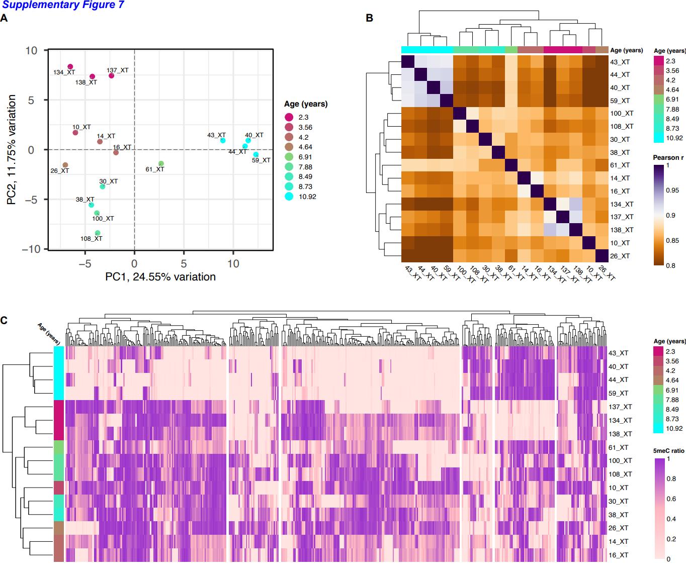 common CpG sites covered by at least 100 reads filtered to remove the variables with low variance (PCAtools, removeVar = 0.1). Samples are colored based on age. (B) Pearson correlation followed by hierarchical clustering using all 100x covered common CpG sites. (C) Heatmap showing the DNA methylation levels of the most variable CpG sites (approximately 500 sites).