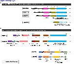 sequence similarity (red/diagonal red stripes). BAH1/BAH2: Bromo-adjacent homology domain (brown/dark orange). (GK)n: glycine-lysine (GK) repeats (bright yellow). DNA-