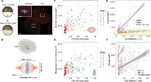 Figure 1—figure supplement 2. Scaling of spindle length vs. width to cell size.(A) Spindle lengths and (B) widths plotted against cell diameter. Gray dotted lines are placed at ~250 μm to help visualize the inflection point reached in spindle length scaling, but not in spindle width scaling. n = 3 biological replicates. Source data are available in Figure 1—source data 1. |