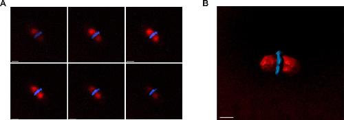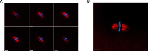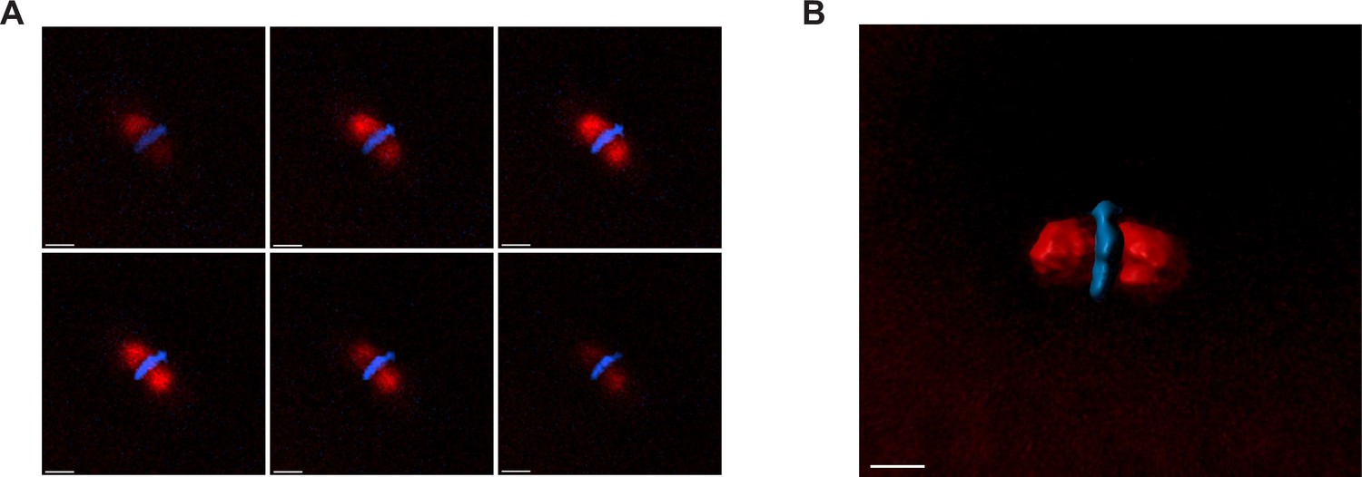 Figure 1—figure supplement 1. 3D segmentation of mitotic spindles.(A) Example z-stacks of the representative spindle shown in Figure 1A. (B) 3D segmentation of the representative spindle, performed using Imaris (see ‘Materials and methods’ for details). Scale bar = 20 μm. |