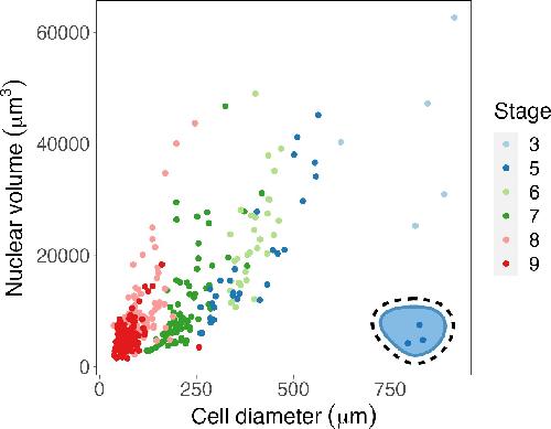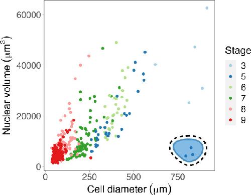 Figure 1—figure supplement 3. Nuclear volumes scale continuously with cell size.Nuclear volumes plotted against cell diameter. Raw data used with permission from Jevtić and Levy, 2015. Source data are available in Figure 1—source data 1. |
