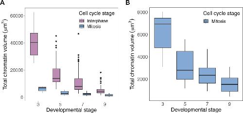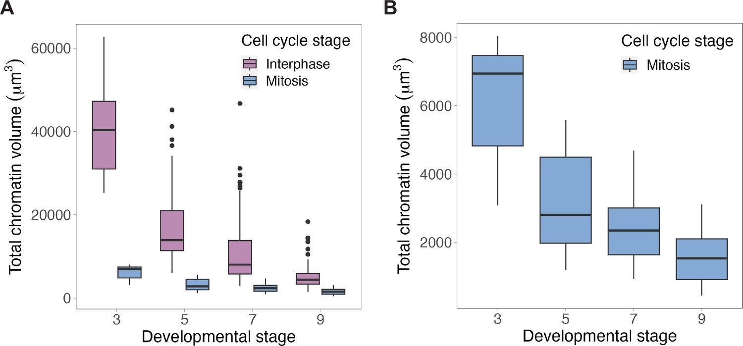 Figure 1—figure supplement 5. Total chromatin volumes in interphase (nuclei) or mitosis (metaphase plates) during early cleavage divisions.(A) Chromatin volumes, either in interphase (purple) or metaphase (blue), binned by developmental stage. (B) Zoomed-in view of metaphase plate volumes. n = 3 biological replicates. Source data are available in Figure 1—source data 1. |