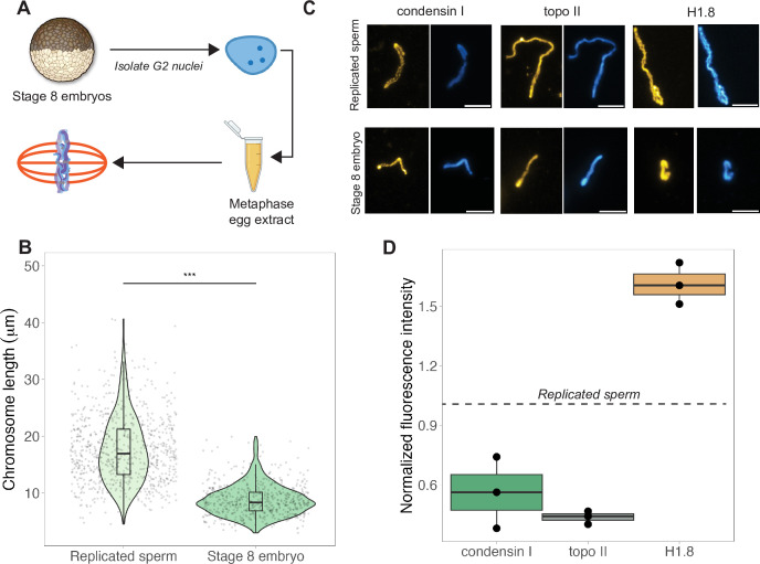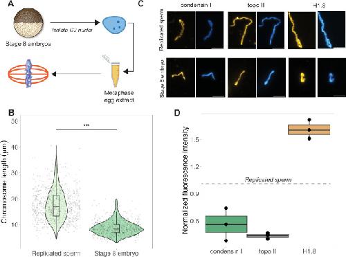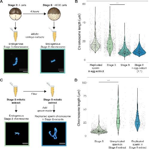 Figure 2. Mitotic chromosomes scale length-wise.(A) Mitotic extracts were prepared from stage 3 or stage 8 embryos, and single endogenous mitotic chromosomes were centrifuged onto coverslips and stained with Hoechst DNA dye. Representative images of stage 3 and stage 8 chromosomes are shown. (B) Length distributions of sperm mitotic chromosomes replicated in egg extract, mitotic chromosomes isolated from embryo extracts and stage 8 embryo extract chromosomes after mixing 1:1 with egg extract. (C) Stage 8 extracts were filtered to remove endogenous chromosomes, then unreplicated or replicated sperm nuclei were added to form mitotic chromosomes. Representative images of an endogenous stage 8 chromosome or replicated sperm chromosome formed in stage 8 extracts. (D) Quantification of chromosome lengths for the experiment shown in (C), for both replicated and unreplicated sperm conditions. n = 3 biological replicates, >50 chromosomes per replicate. Scale bar = 10 μm. ***p<0.001 by the Mann–Whitney U test. Source data are available as Figure 2—source data 1. Figure 2—source data 1. This file contains all of the source data for Figure 2 and the related supplemental figure. |