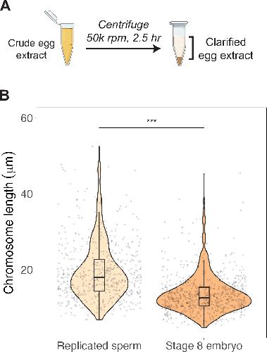 Figure 3—figure supplement 1 Clarified egg extracts support mitotic chromosome scaling. (A) Crude extracts were centrifuged at high speed to pellet membranes. (B) Quantification of mitotic chromosome lengths from either replicated sperm nuclei or stage 8 embryo nuclei added to clarified metaphase egg extracts. n = 3 biological replicates, >50 chromosomes per replicate. ***p<0.001 by the Mann–Whitney U test. Source data are available in Figure 3—source data 1. |